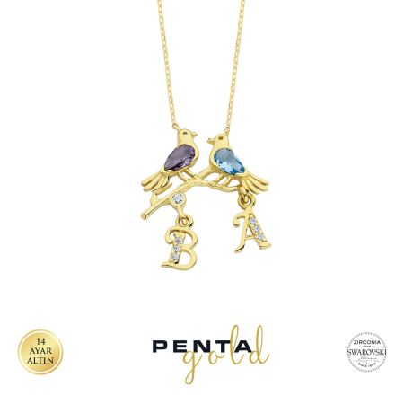 14 Ayar Altın Çift Kuşlu Harfli Swarovski Kolye