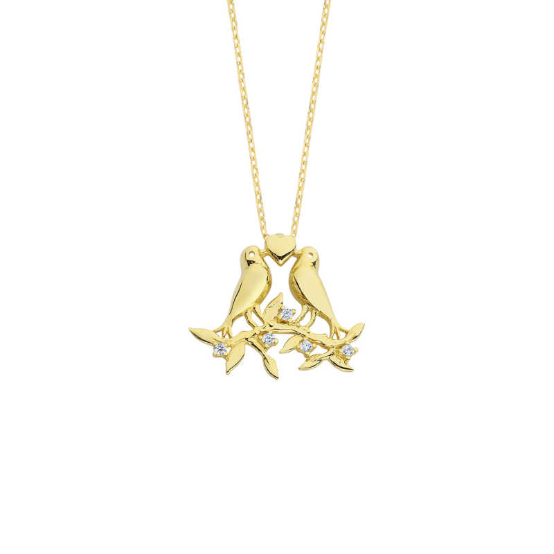 14 Ayar Altın Kalpli Kuşlu Swarovski Kolye
