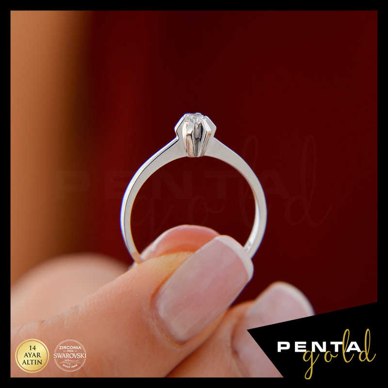 14 Ayar Altın Oval Altı Tırnak Tektaş Yüzük 0,12 ct. Swarovski Taşlı