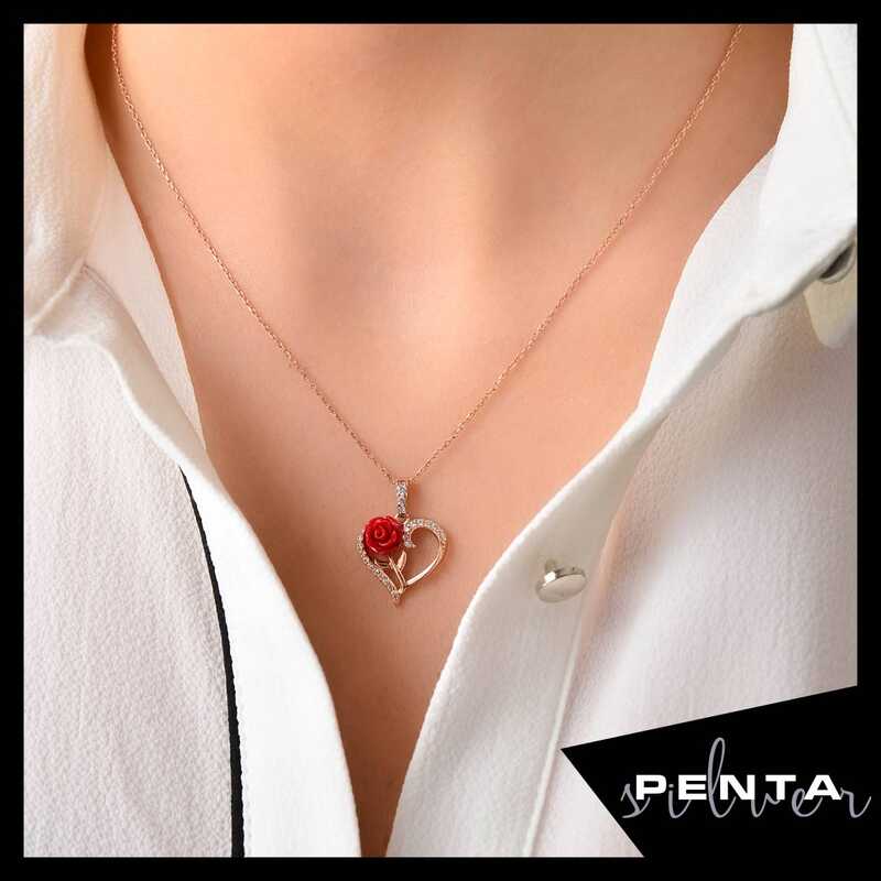 Güllü Kalp Gümüş Kolye